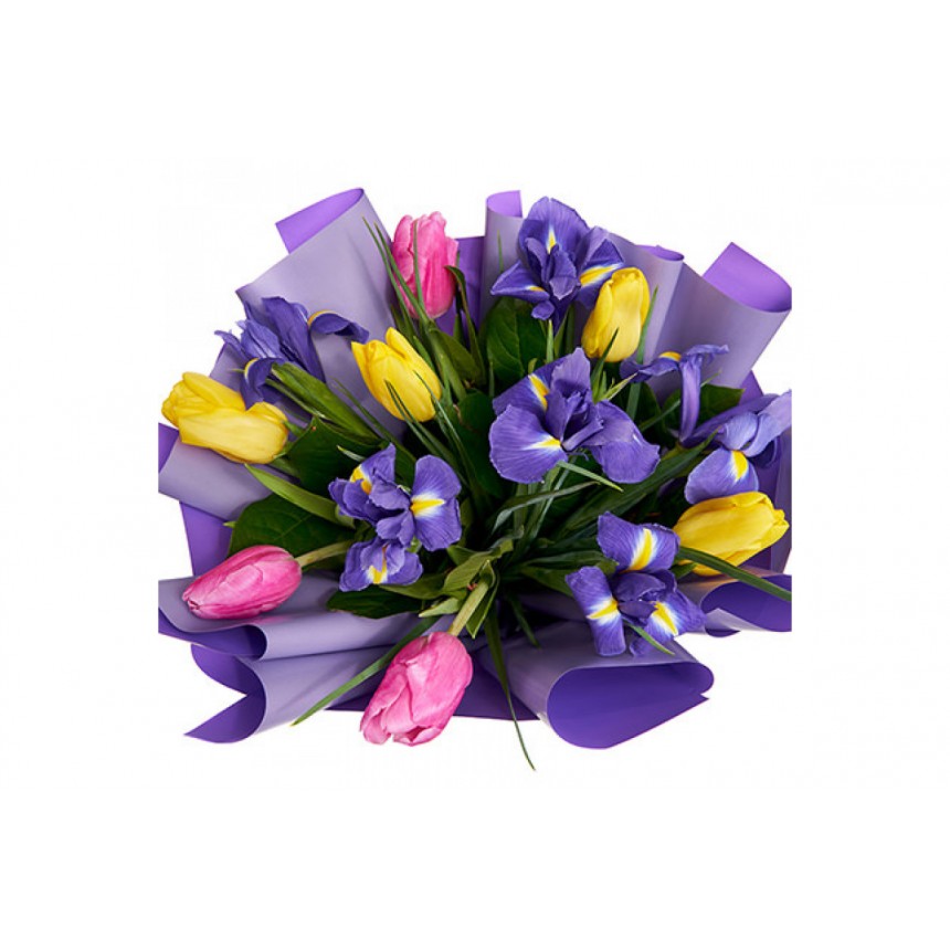 7 різнокольорових тюльпанів, 6 синіх (фіолетових) ірисів, зелень, оздоблення.
