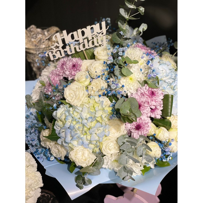 Гіпсофіла, хризантема, гортензія, евкаліпт, аспедистра, троянда гілка Міс Бомбастик.
