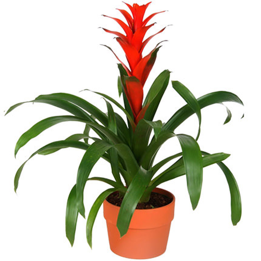 Опис рослини: Гузманія - ефектна тропічна рослина з подовженим блискучим листям, зібраним у прикореневу розетку, з центру якої з'являється незвичайне колосоподібне суцвіття, утворене яскраво забарвленим листям-приквітниками