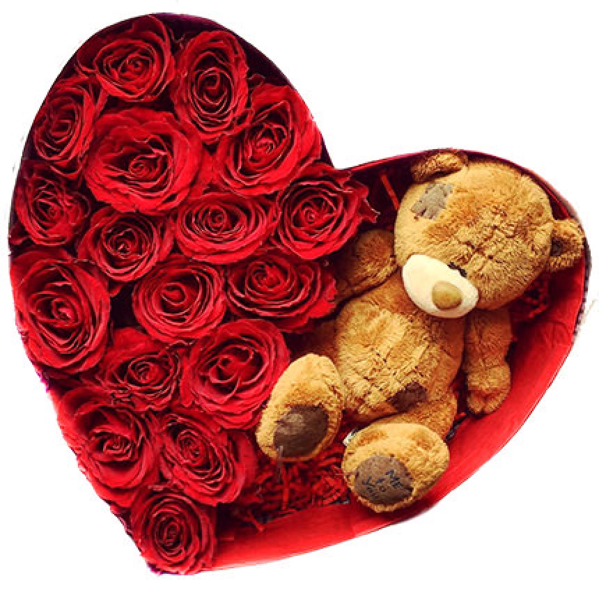 17 червоних троянд, ведмедик тедді, декоративна коробка, флористичний матеріал.