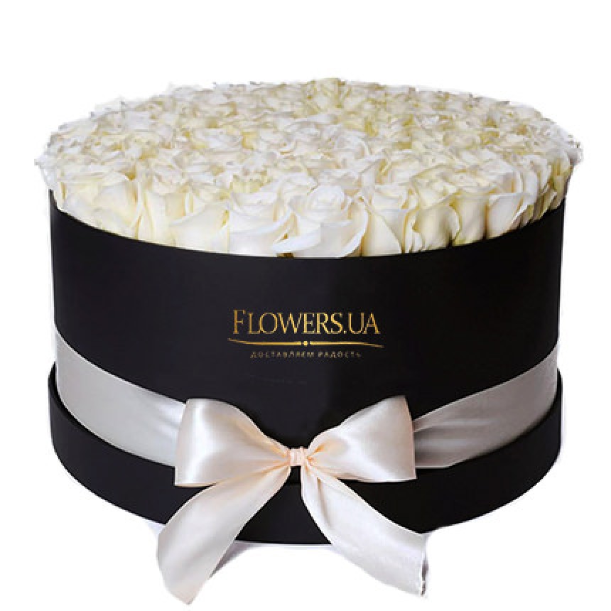 101 біла троянда, декоративна коробка, флористичний матеріал.
