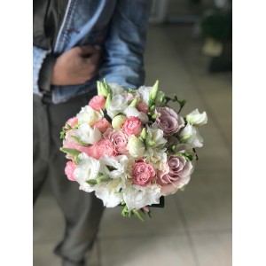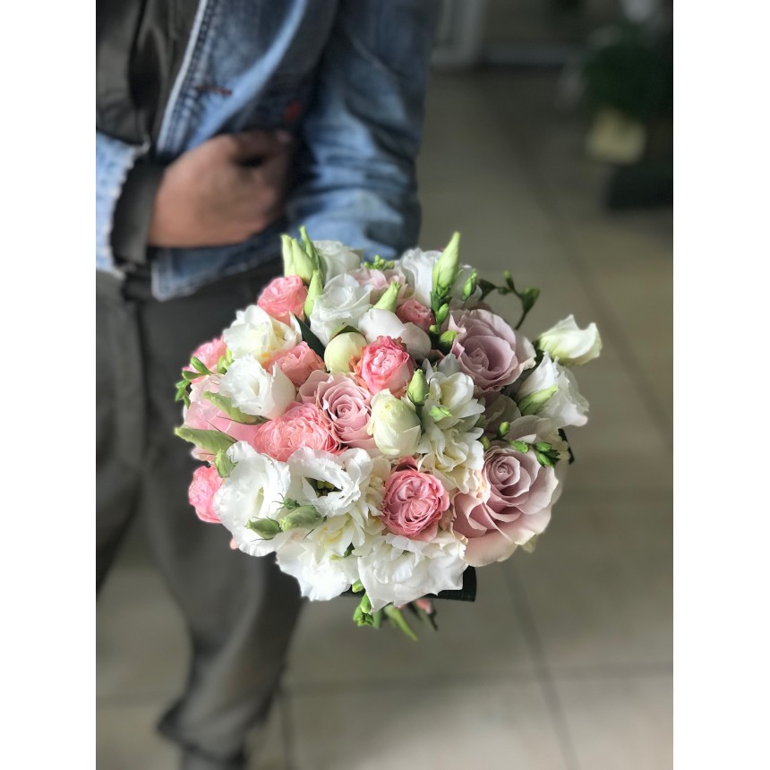 Н. Весільний букет 7, букети, Еустома, фрезія, троянда меморі, троянда бомбастик