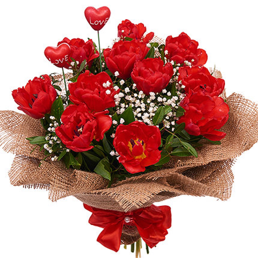 Порадуйте Вашу любимую букетом весенних красных тюльпанов в романтичном праздничном оформлении!