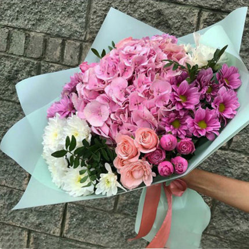гортензия, 4 ветки розовой кустовой розы, 4 ветки белой и розовой ромашковой хризантемы, зелень, оформление может отличаться.