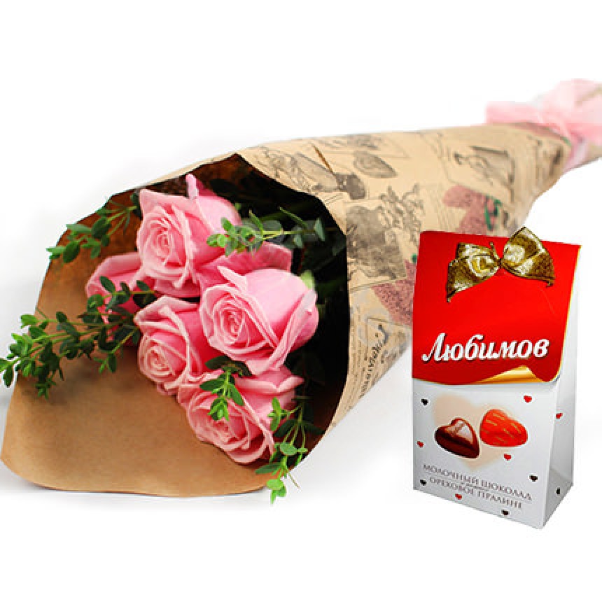 5 розовых роз , оформление может отличаться, конфеты "Любимов" - 100 гр.