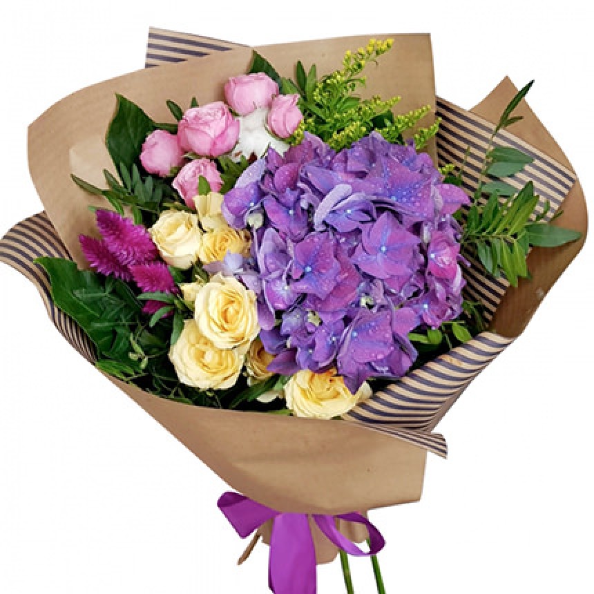 гортензия, 6 веток кустовой розовой и кремовой розы, зелень, оформление может отличаться.