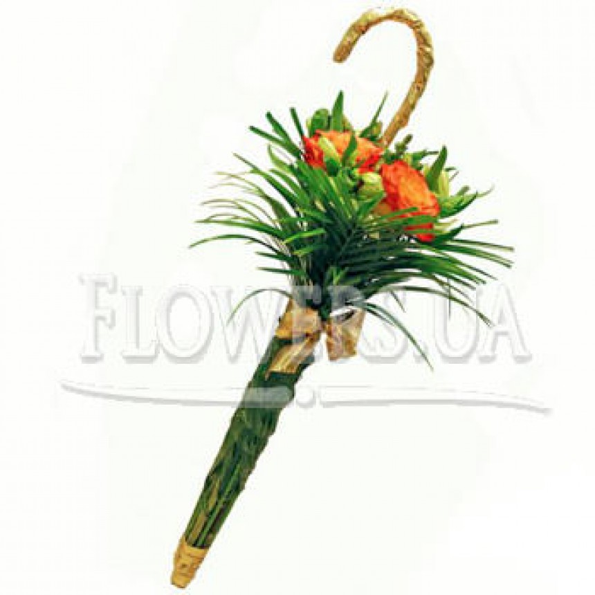 Описание композиции: Оригинальная цветочная композиция в виде зонта. Подарит солнечное настроение в дождливый день. Прекрасный подарок бизнесс партнеру как мужчине, так и женщине. Состав: 3 красные розы, 4 ветки альстромерии, зелень, флористический материал.