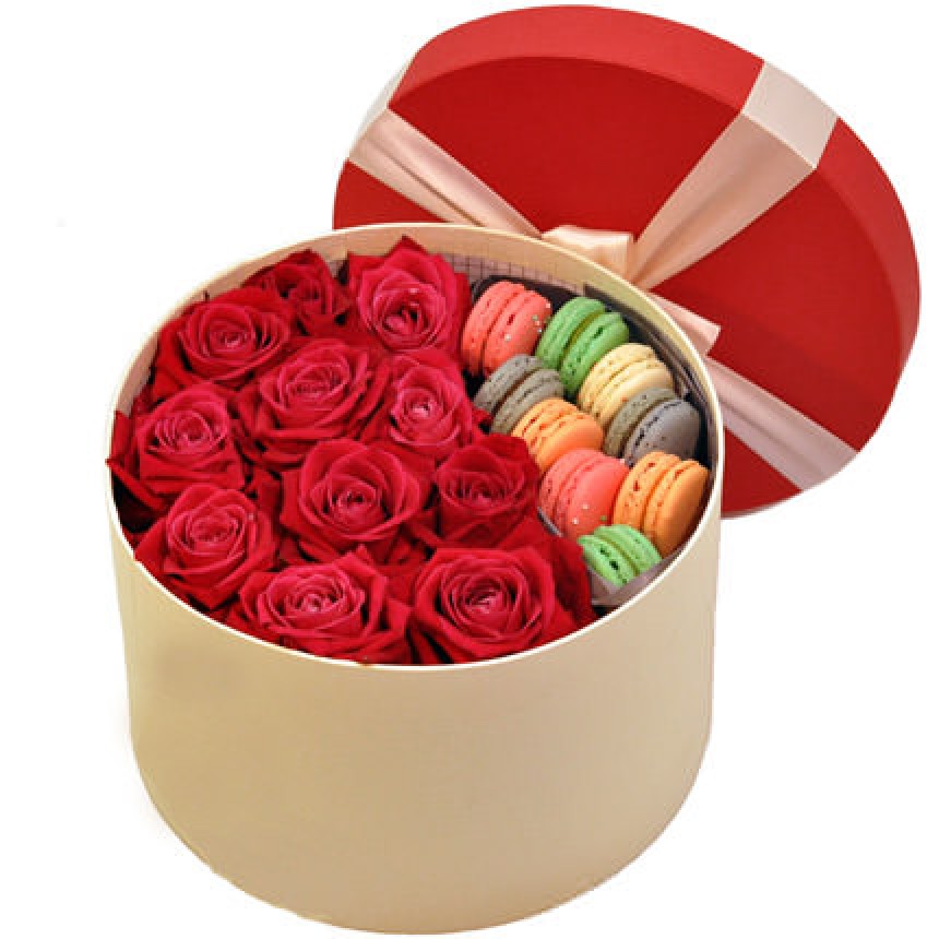 печенье Macaron - 9 шт., 11 красных роз, декоративная коробка, флористический материал.
