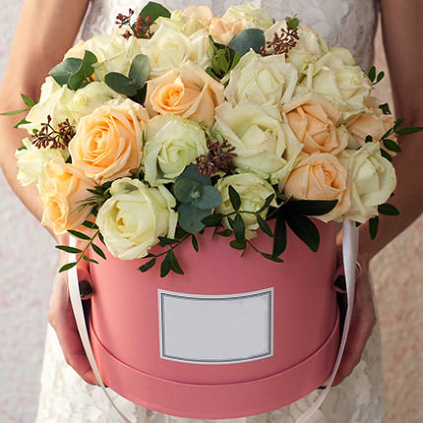 35 белых и кремовых роз, зелень, декоративная коробка, флористический материал.