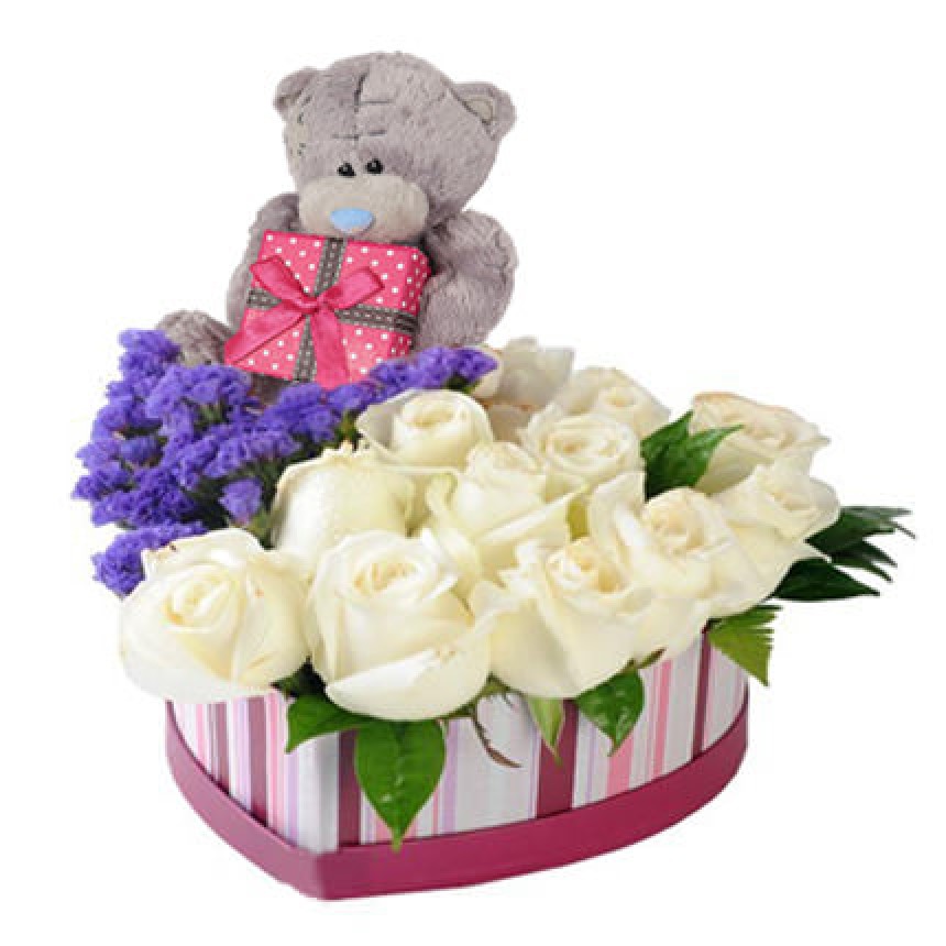 11 белых роз, мишка тедди, статица, зелень, декоративная коробка в форме сердца, флористический материал.
