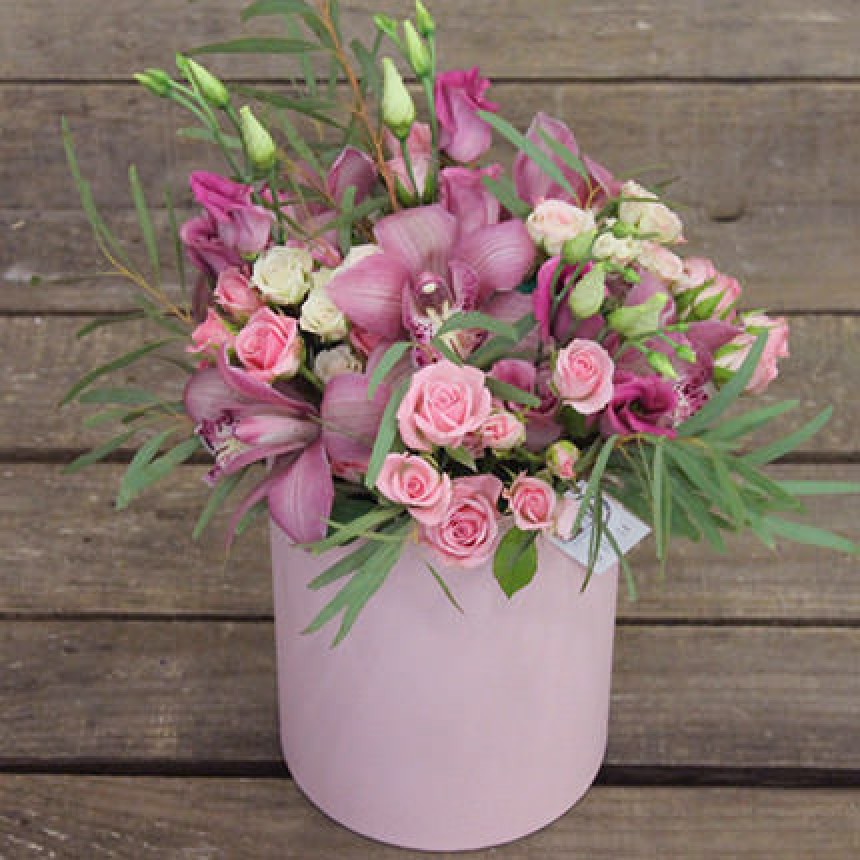 Описание композиции: Для прекрасной и неповторимой, для самой обаятельной и привлекательной, для нежной и милой - для любимой! Состав композиции: 3 цветков орхидеи, 4 ветки нежной эустомы, 8 веток кремовой и розовой кустовой розы, зелень, декоративная коробка, флористический материал.