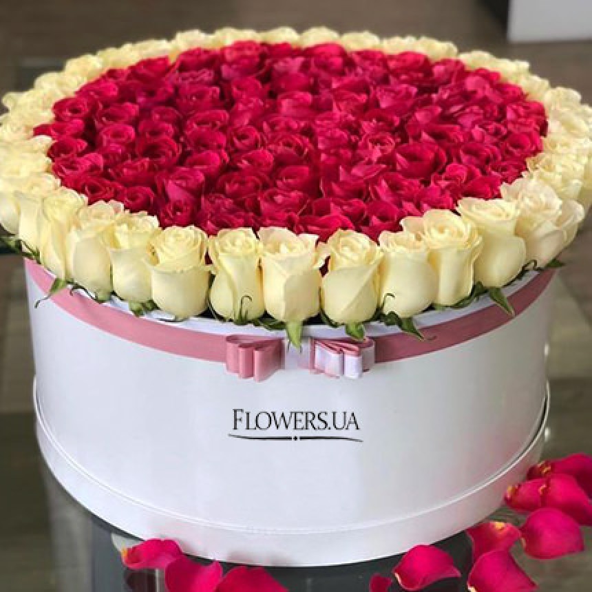 101 белая и розовая роза, декоративная коробка, флористический материал.