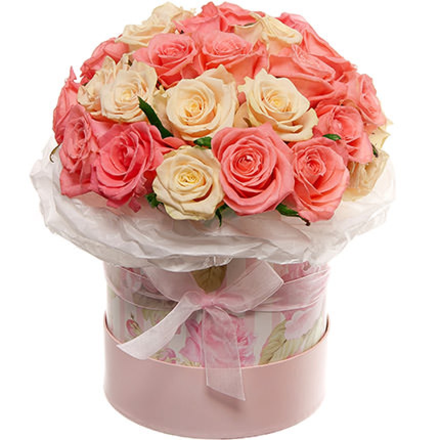 25 кремовых и розовых роз , декоративная коробка, флористический материал.