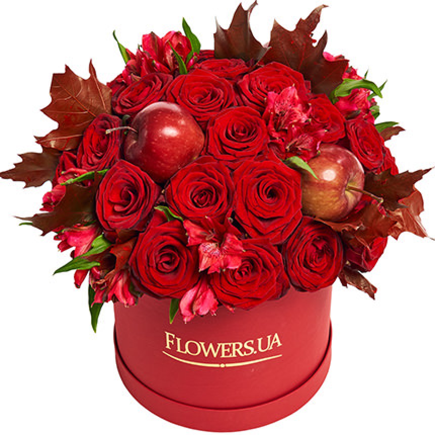 27 красных роз, 5 альстромерий, 3 яблока, листья куэркуса, декоративная коробка, флористический материал.