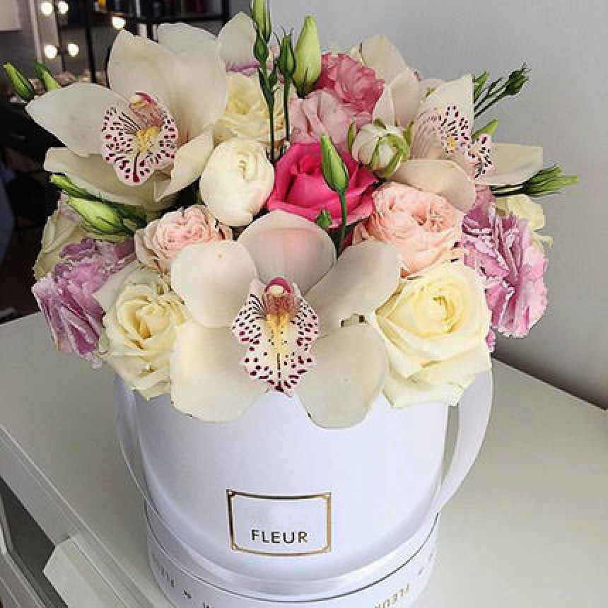 3 цветка орхидеи, 13 белых , кремовых и розовых роз, 4 ветки нежной эустомы, зелень, декоративная коробка, флористический материал.