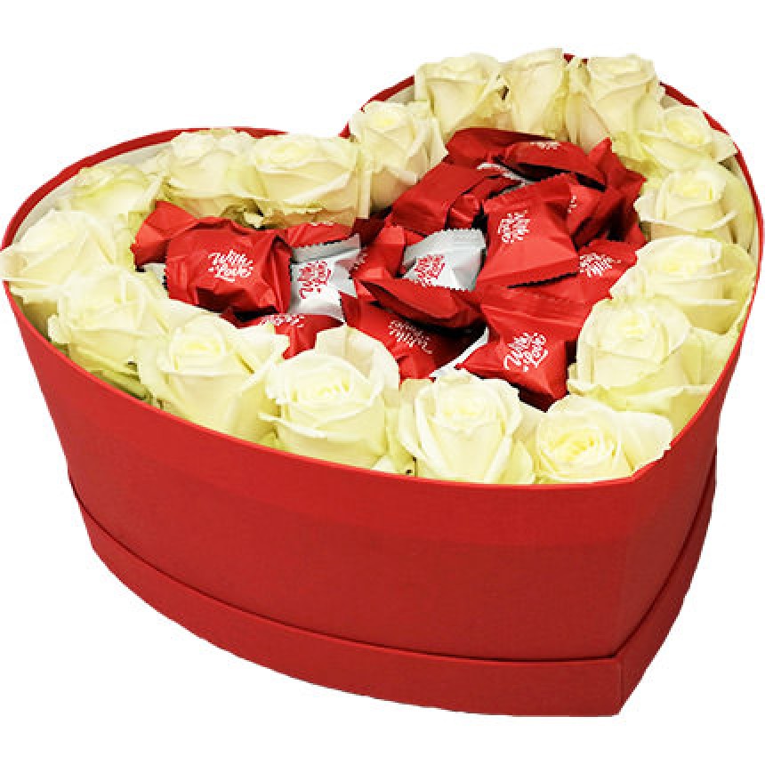 Описание композиции: Классическая композиция не утратила своей актуальности и сегодня - это топовый презент для самых близких и дорогих людей! Состав композиции: 17 белых роз, конфеты "Любимов" - 24 шт., декоративная коробка в форме сердца, флористический материал.