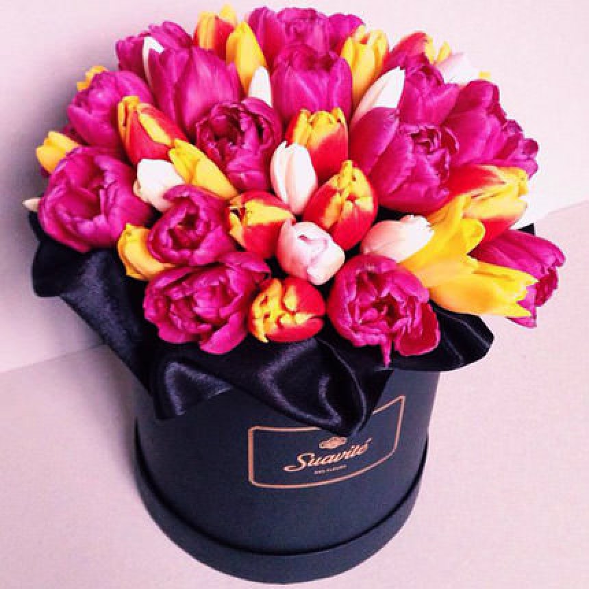 Описание композиции: Бум в мире флористики! Шикарное сочетание ярких весенних цветов играющих на контрасте с темным оформлением - будьте оригинальны в поздравлении любимых! Состав композиции: 25 разноцветных тюльпанов, декоративная коробка, флористический материал.
