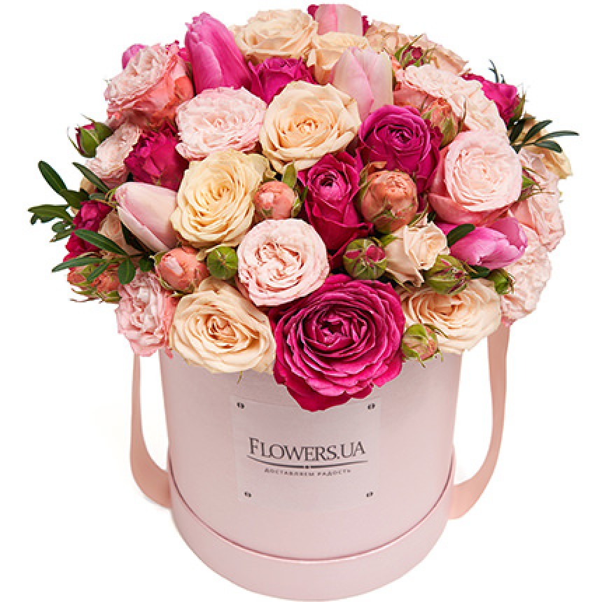 7 розовых тюльпанов, 10 веток кустовой розовой и кремовой розы, зелень, декоративная коробка, флористический материал.