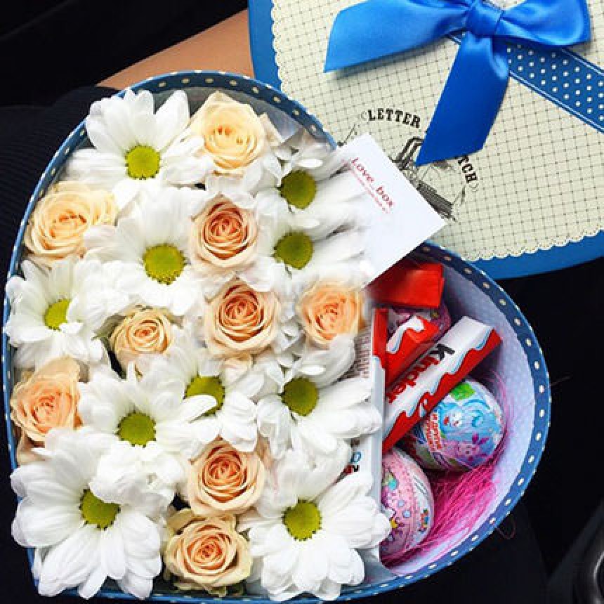 3 киндер сюрприза, шоколад "Kinder"(8 порций), 2 ветки белой ромашковой хризантемы, ветка кустовой кремовой розы, декоративная коробка, флористический материал.