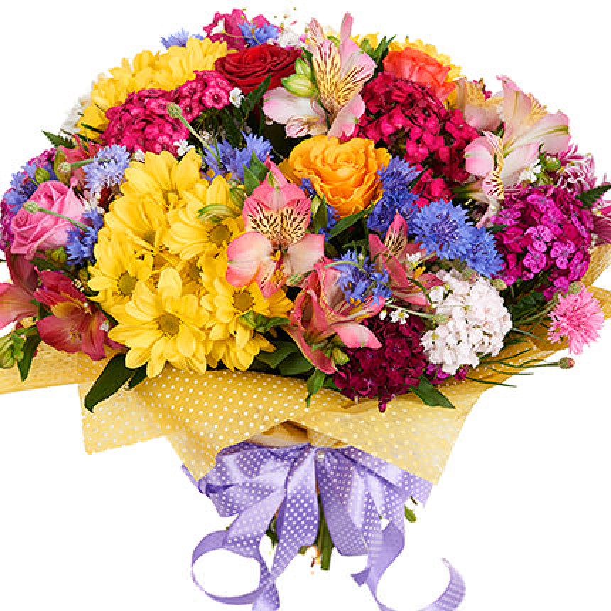 5 разноцветных роз, 7 веток разноцветной хризантемы, 5 разноцветных альстромерий, зелень, гипсофила, оформление может отличаться.