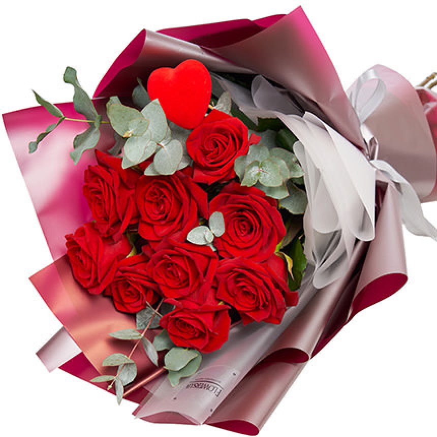 9 красных роз, декоративное сердце (в ассортименте), эвкалипт, оформление.